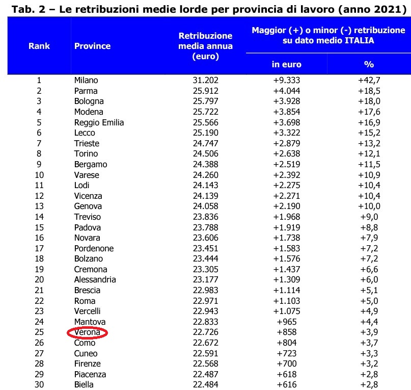 Quanto pesa la busta paga a Verona? A mettere insieme i dati ci ha pensato l’Ufficio studi della Cgia di Mestre. A Verona, nel 2021, la retribuzione media lorda di un dipendente del settore privato era di 22.726 euro, ovvero il 3,9% in più rispetto alla media nazionale. Il che colloca Verona al quarto posto in Veneto, e al 25esimo in Italia. Per restare nella nostra regione, la retribuzione media più elevata si registra a Vicenza, con 24.139 euro (+10,4% rispetto alla media nazionale).