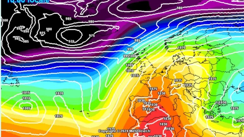 Nell’immagine la pressione in quota ed al suolo prevista per domenica mattina (ICON DWD by meteociel.fr)