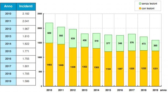 In circa dieci anni si è scesi da 2182 incidenti del 2010 ai 1586 del 2019. Per i feriti si passa dai 1925 del 2009 ai 1439 del 2019, circa cinquecento in meno. Delle persone coinvolte 2560, ovvero il 68%, sono uomini, mentre 1211, quindi il 32% sono donne.