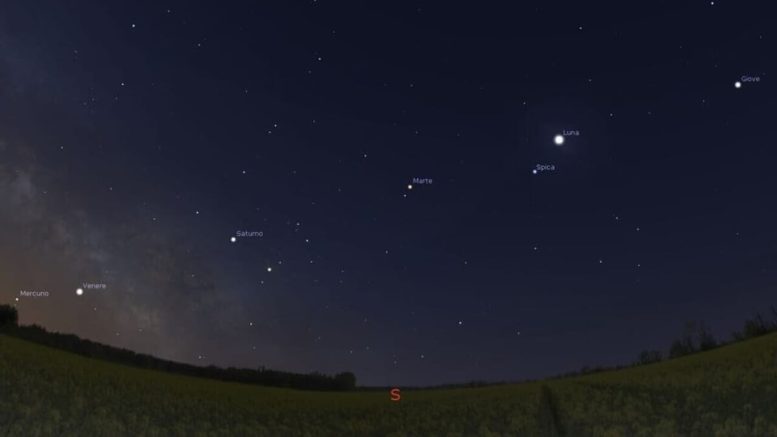 Il pianeta più alto nel cielo sarà Marte, facilmente riconoscibile per il suo caratteristico colore rossastro. Si troverà nella costellazione dei Gemelli, ben visibile sopra l’orizzonte sud. Giove, il secondo pianeta più luminoso, apparirà più in basso nella costellazione del Toro. Urano, situato al confine tra l’Ariete e il Toro, sarà più difficile da individuare a occhio nudo, ma con un cielo particolarmente scuro e limpido potrebbe essere visibile anche senza strumenti ottici.