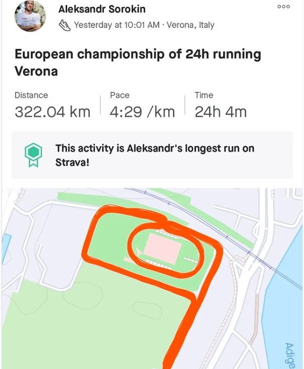 Incredibile record di Sorokin: ha cominciato a correre alle 10 di mattina di sabato 17, ha smesso alle 10 di mattina di domenica 18, 24 ore dopo. Risultato? Nuovo record del mondo dell’ultra runner lituano Aleksandr Sorokin: 319,614km, oltre 10km di progresso in confronto ai 309,399km del 2021. Un record stabilito ai campionati europei 24 ore (Lupatotissima) che si sono svolti lo scorso fine settimana al campo sportivo Consolini di Verona.