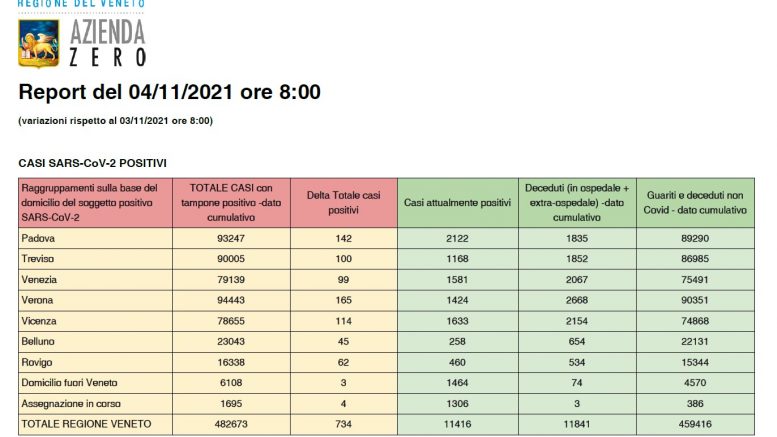 Comincia a diventare allarmante la crescita dei contagi da Covid in Veneto e a Verona, e il trend in costante aumento non frena. Sono infatti 734 i nuovi positivi da Coronavirus registrati da ieri mattina, mercoledì 3 novembre, in Veneto, che portano il totale dei casi attualmente positivi, ancora in aumento, a 11.416. Quattro i decessi. I decessi sono stati 4. Nello stesso periodo invece sono stati 165 (ieri 115) i nuovi positivi registrati nella sola provincia di Verona: il numero degli attualmente positivi a Verona e provincia è ora di 1.424 (+ 87).