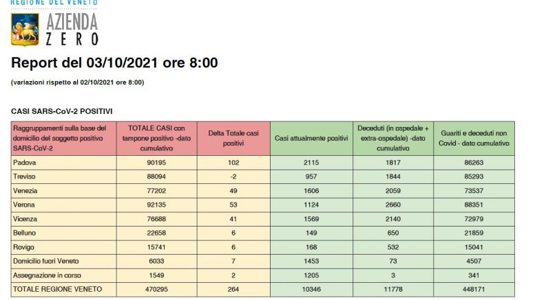Sono 264, poco più della metà rispetto a ieri, i nuovi positivi da Coronavirus registrati da ieri mattina, sabato 2 ottobre, in Veneto, che portano il totale dei casi attualmente positivi a 10.346, ancora in calo rispetto ai giorni precedenti (-87). Nello stesso periodo invece sono stati 53 (ieri 75) i nuovi positivi registrati nella sola provincia di Verona: il numero degli attualmente positivi a Verona e provincia è ora di 1.124 (+10): tornano quindi ad aumentare.