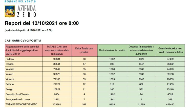 Sono 348 (ieri 342) i nuovi positivi da Coronavirus registrati da ieri mattina, martedì 12 ottobre, in Veneto, che portano il totale dei casi attualmente positivi a 9.123, ovvero 108 meno di ieri. Nello stesso periodo invece sono stati 90 (ieri 66) i nuovi positivi registrati nella sola provincia di Verona: il numero degli attualmente positivi a Verona e provincia è ora di 1.052, 21 meno di ieri.