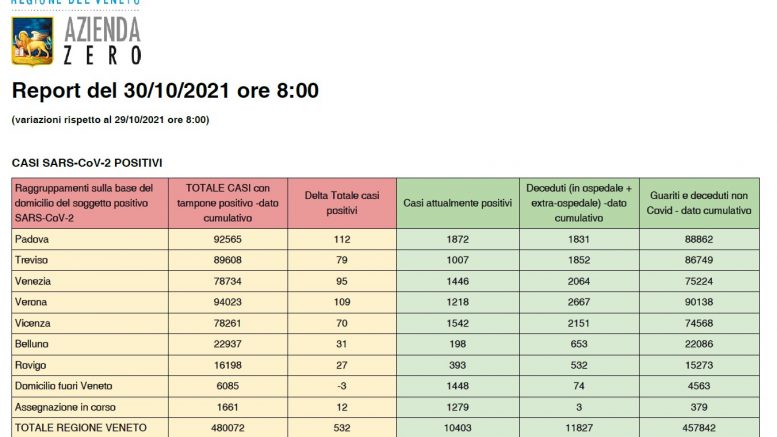 Sono 532 (ieri 523) i nuovi positivi da Coronavirus registrati da ieri mattina, venerdì 29 ottobre, in Veneto, che portano il totale dei casi attualmente positivi, ancora in aumento, a 10.403, 188 più di ieri. Quattro i decessi. Nello stesso periodo invece sono stati 109 (ieri 75) i nuovi positivi registrati nella sola provincia di Verona: il numero degli attualmente positivi a Verona e provincia è ora di 1.218, 34 più di ieri.