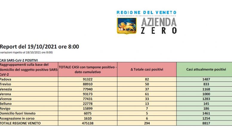 Sono 294 (ieri 155) i nuovi positivi da Coronavirus registrati da ieri mattina, lunedì 18 ottobre, in Veneto, che portano il totale dei casi attualmente positivi a 8.817. Nello stesso periodo invece sono stati 61 (ieri 22) i nuovi positivi registrati nella sola provincia di Verona: il numero degli attualmente positivi a Verona e provincia è ora di 1.000 esatti, confermando il trend in calo.