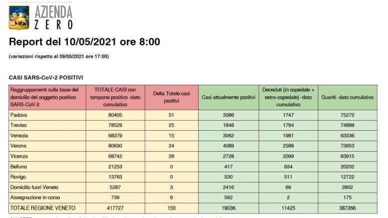 Sono 150 i nuovi contagi da Coronavirus registrati dal pomeriggio di ieri, domenica, in Veneto, che portano il totale dei casi attualmente positivi a 19.036, dieci in più rispetto a ieri. Nello stesso periodo sono 24 i nuovi positivi registrati in provincia di Verona, dalle 17 di ieri: il numero degli attualmente positivi a Verona e provincia è ora di 4089, in aumento di 30 unità da ieri mattina e sempre con il poco invidiabile primato di provincia con più casi del Veneto.