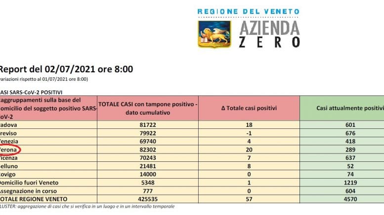 Sono 57 i nuovi positivi da Coronavirus registrati da ieri sera, giovedì 1 luglio, in Veneto, che portano il totale dei casi attualmente positivi a 4.570, in leggero calo (-4) rispetto a ieri. Nello stesso periodo invece ben 20 i nuovi positivi registrati in provincia di Verona: il numero degli attualmente positivi a Verona e provincia è ora di 289, valore in crescita (+8) per il terzo giorno consecutivo.