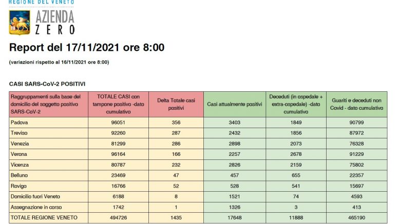 Salgono ancora, avvicinandosi ai 1.500, i nuovi contagi in Veneto nelle ultime 24 ore: sono infatti 1.435 (ieri 1.278) i nuovi positivi da Coronavirus registrati da ieri mattina, martedì 16 novembre, in Veneto, che portano il totale dei casi attualmente positivi, ancora in aumento, a 17.648, ovvero 703 più di ieri. Sei i decessi registrati nelle ultime 24 ore. Nello stesso periodo invece sono stati 166 (ieri 185) i nuovi positivi registrati nella sola provincia di Verona: il numero degli attualmente positivi a Verona e provincia è ora di 2.257 (+45).