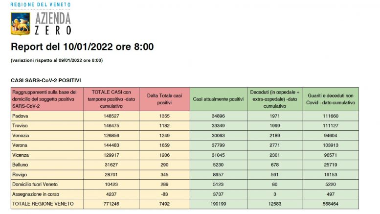 Covid a Verona e in Veneto, contagi in calo dovuti come sempre al minor numero di tamponi effettuali nella giornata festiva, ma ricoveri in deciso aumento. Ecco il bollettino aggiornato: nelle ultime 24 ore in Veneto si sono registrati 7.492 nuovi positivi (ieri 13.973), che portano il totale dei casi attualmente positivi a 190.199, ovvero 5.740 più di ieri. I decessi registrati nelle ultime 24 ore sono 23. Nello stesso periodo invece sono stati 1.659 (ieri 3.034) i nuovi positivi registrati nella sola provincia di Verona: il numero degli attualmente positivi a Verona e provincia è ora di 37.799 (+1.342).