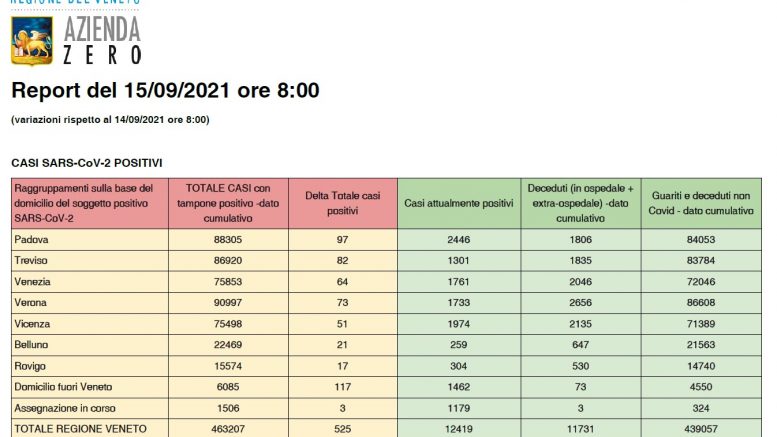 Sono 525 i nuovi positivi da Coronavirus registrati da ieri mattina, martedì 14 settembre, in Veneto, che portano il totale dei casi attualmente positivi a 12.419, in sensibile calo rispetto ai giorni precedenti. Nello stesso periodo invece sono 73 (ieri 81) i nuovi positivi registrati nella sola provincia di Verona: il numero degli attualmente positivi a Verona e provincia è ora di 1.733, ovvero 32 meno di ieri.