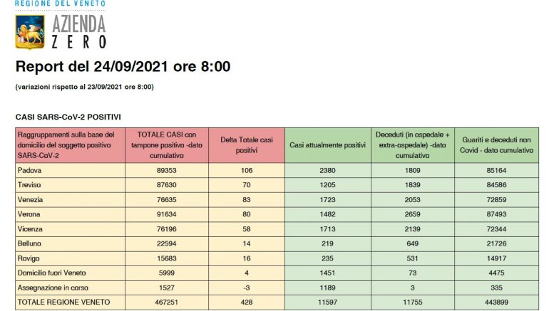 Sono 428 (ieri 445) i nuovi positivi da Coronavirus registrati da ieri mattina, giovedì 23 settembre, in Veneto, che portano il totale dei casi attualmente positivi a 11.597, ancora in calo (-64) rispetto ai giorni precedenti. Nello stesso periodo invece sono stati 80, contro i 57 di ieri, i nuovi positivi registrati nella sola provincia di Verona: il numero degli attualmente positivi a Verona e provincia è ora di 1.482, ovvero 3 più di ieri.