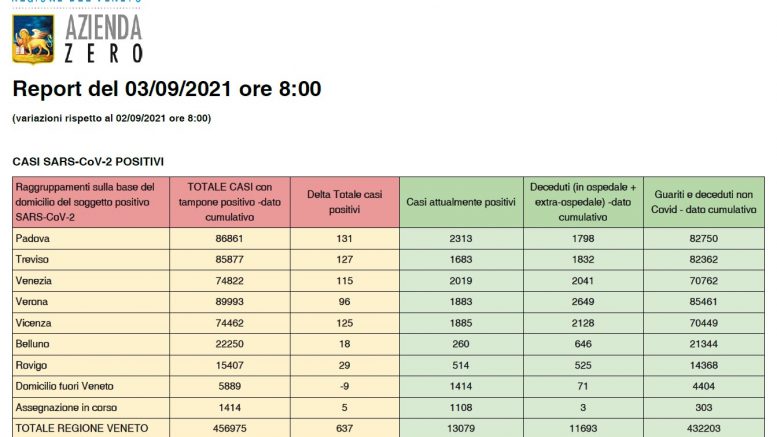 Sono 637 i nuovi positivi da Coronavirus registrati da ieri mattina, giovedì 2 settembre, in Veneto, che portano il totale dei casi attualmente positivi a 13.079, ovvero 23 più di ieri. Nello stesso periodo invece sono 96, contro i 151 di ieri, i nuovi positivi registrati nella sola provincia di Verona: il numero degli attualmente positivi a Verona e provincia è ora di 1.883, ovvero 6 più di ieri.