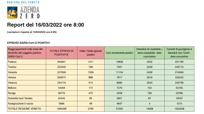 Covid a Verona e in Veneto, ecco il bollettino aggiornato: nelle ultime 24 ore in Veneto si sono registrati 5.795 (ieri 7.313) nuovi positivi. Il totale dei casi attualmente positivi è ora di 57.002, in aumento di quasi 2mila unità. I decessi registrati nelle ultime 24 ore sono 11, dei quali 5 a Verona. Nello stesso periodo invece sono stati 888 (ieri 1.185) i nuovi positivi registrati nella sola provincia di Verona: il numero degli attualmente positivi a Verona e provincia è ora di 7.817, in lieve diminuzione.