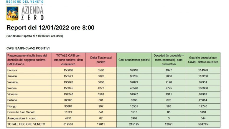 Covid a Verona e in Veneto, continua la corsa dei contagi. Ecco il bollettino aggiornato: nelle ultime 24 ore in Veneto si sono registrati 19.811 nuovi positivi (ieri 21.504), che portano il totale dei casi attualmente positivi a 215.195, ovvero 9.496 più di ieri. I decessi registrati nelle ultime 24 ore sono 30. Nello stesso periodo invece sono stati 4.277 (dato peggiore della regione per il secondo giorno consecutivo, ieri 4.585) i nuovi positivi registrati nella sola provincia di Verona: il numero degli attualmente positivi a Verona e provincia è ora di 43.590 (+2.243).
