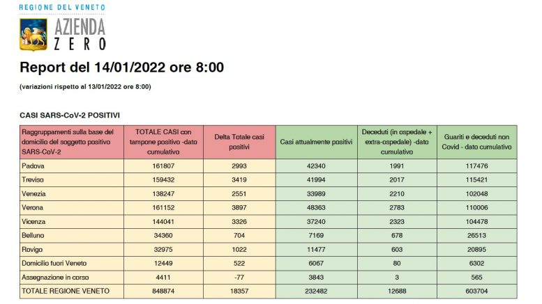 Covid a Verona e in Veneto, ecco il bollettino aggiornato: nelle ultime 24 ore in Veneto si sono registrati 18.357 nuovi positivi (ieri 17.956), che portano il totale dei casi attualmente positivi a 232.482, ovvero 8.337 più di ieri. I decessi registrati nelle ultime 24 ore sono 19. Nello stesso periodo invece sono stati 3.897 (dato peggiore della regione per il quarto giorno consecutivo, ieri 3.910) i nuovi positivi registrati nella sola provincia di Verona: il numero degli attualmente positivi a Verona e provincia è ora di 48.363 (+2.337).