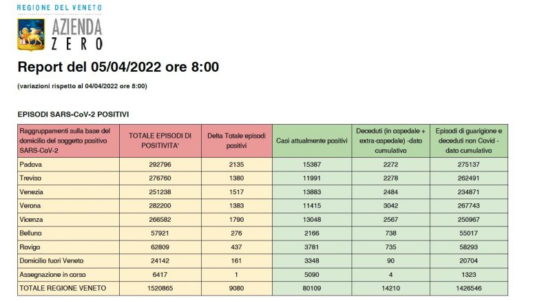 Covid a Verona e in Veneto, ecco il bollettino aggiornato: nelle ultime 24 ore in Veneto si sono registrati 9.080 nuovi positivi. Il totale dei casi attualmente positivi è ora di 80.109. I decessi registrati nelle ultime 24 ore sono 17, dei quali 3 a Verona. Nello stesso periodo invece sono stati 1.383 i nuovi positivi registrati nella sola provincia di Verona: il numero degli attualmente positivi a Verona e provincia è ora di 11.415.