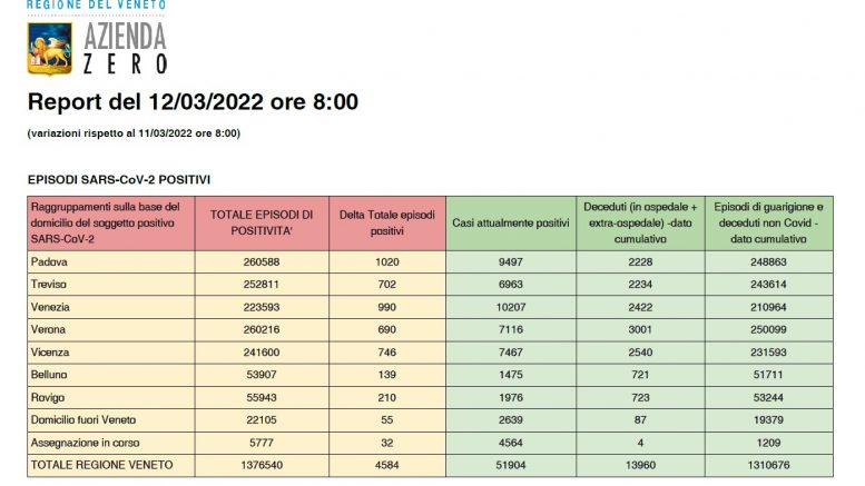Covid a Verona e in Veneto, ecco il bollettino aggiornato: nelle ultime 24 ore in Veneto si sono registrati 4.584 (ieri 4.461) nuovi positivi. Il totale dei casi attualmente positivi è ora di 51.904, di nuovo in aumento di circa mille unità. I decessi registrati nelle ultime 24 ore sono 10 (ieri 6), dei quali però nessuno a Verona. Nello stesso periodo invece sono stati 690 (ieri 674) i nuovi positivi registrati nella sola provincia di Verona: il numero degli attualmente positivi a Verona e provincia è ora di 7.116, anche in questo caso in aumento.