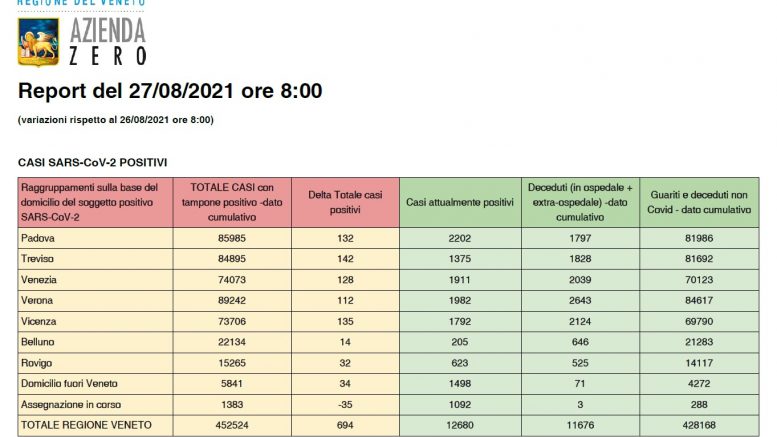 Sono 694, ancora in lieve flessione rispetto agli 719 di ieri, i nuovi positivi da Coronavirus registrati da ieri mattina, mercoledì 25 agosto, in Veneto, che portano il totale dei casi attualmente positivi a 12.680, ovvero 61 più di ieri. Nello stesso periodo invece sono 112, in calo rispetto ai 139 di ieri, i nuovi positivi registrati nella sola provincia di Verona: il numero degli attualmente positivi a Verona e provincia è ora di 1.982 (94 meno di ieri), di nuovo sotto i 2mila.
