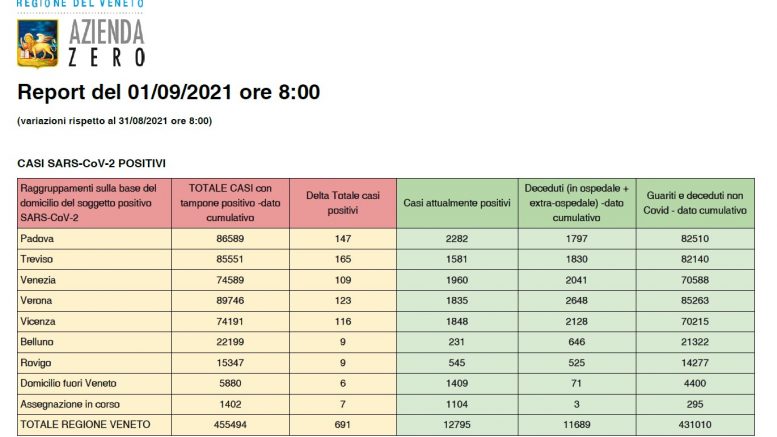 Sono 691, in sensibile aumento rispetto ai 583 di ieri, i nuovi positivi da Coronavirus registrati da ieri mattina, martedì 31 agosto, in Veneto, che portano il totale dei casi attualmente positivi a 12.795. Nello stesso periodo invece sono 123 i nuovi positivi registrati nella sola provincia di Verona: il numero degli attualmente positivi a Verona e provincia è ora di 1.835, 59 meno di ieri.