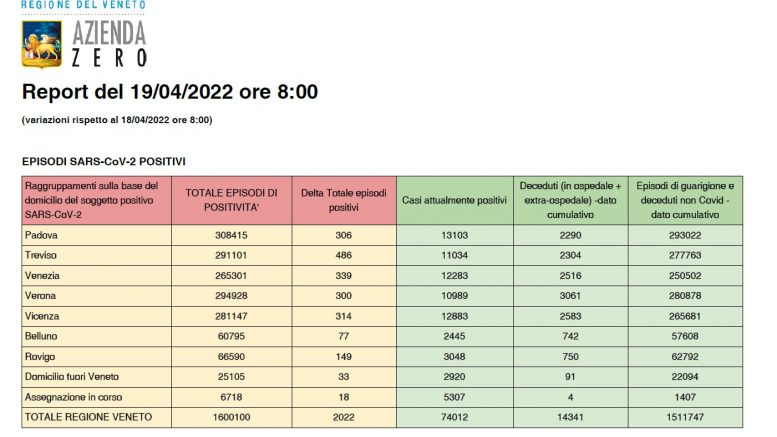 Covid a Verona e in Veneto, ecco il bollettino aggiornato: nelle ultime 24 ore in Veneto si sono registrati 2.022 nuovi positivi, dato che risente inevitabilmente dei pochi tamponi nei giorni di Pasqua e Pasquetta. Il totale dei casi attualmente positivi è ora di 74.012. I decessi registrati nelle ultime 24 ore sono 23, dei quali nessuno a Verona. Nello stesso periodo invece sono stati 300 i nuovi positivi registrati nella sola provincia di Verona: il numero degli attualmente positivi a Verona e provincia è ora di 10.989.