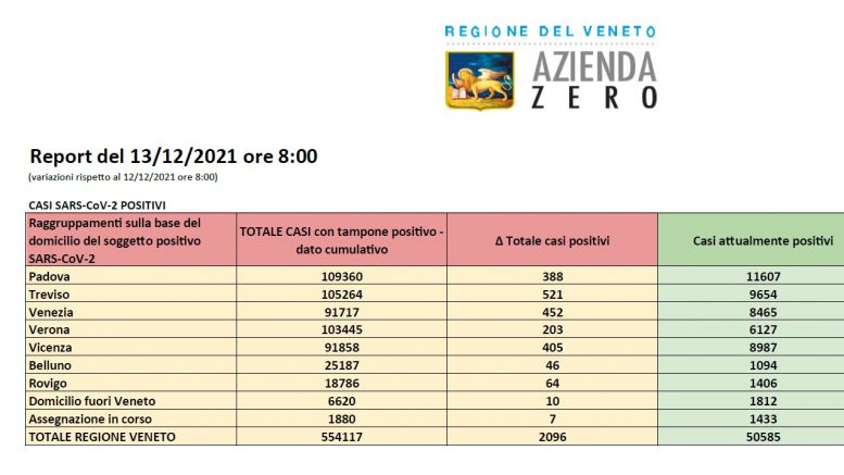 Nelle ultime 24 ore in Veneto si sono registrati 2.096 nuovi positivi (ieri 3.271), che portano il totale dei casi attualmente positivi a 50.585, ovvero 1.344 più di ieri. Dieci i decessi registrati nelle ultime 24 ore. Nello stesso periodo invece sono stati 203 (ieri 451) i nuovi positivi registrati nella sola provincia di Verona: il numero degli attualmente positivi a Verona e provincia è ora di 6.127 (+180).