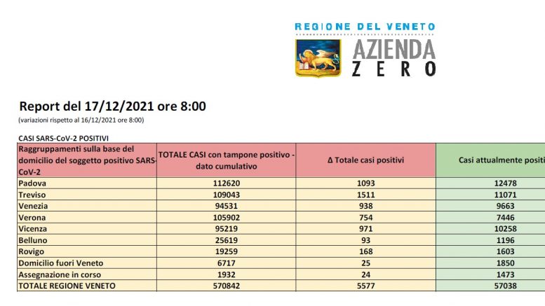 Nelle ultime 24 ore in Veneto si sono registrati 5.577 nuovi positivi (ieri 3.383), che portano il totale dei casi attualmente positivi a 57.038, ovvero 3.100 più di ieri. I decessi registrati nelle ultime 24 ore sono 10. Nello stesso periodo invece sono stati 754 (ieri 511) i nuovi positivi registrati nella sola provincia di Verona: il numero degli attualmente positivi a Verona e provincia è ora di 7.446 (+442).