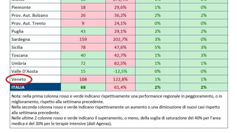 Intanto in Veneto le caselle del monitoraggio relative a numero di contagi e percentuale di crescita continuano ad essere rosse, mentre rimane ferma ad un rassicurante 1 per cento la percentuale di occupazione degli ospedali, sia in area non critica che in terapia intensiva.