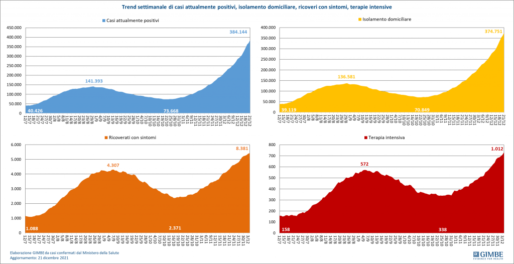 “Da oltre due mesi – dichiara Nino Cartabellotta, presidente della Fondazione Gimbe – si assiste ad un aumento dei nuovi casi, che nelle ultime due settimane ha subìto una forte accelerazione. La media mobile a 7 giorni dei nuovi casi è passata da 15.521 dell’8 dicembre a 25.322 il 21 dicembre (+63,2%), un’impennata favorita anche dalla rapida e progressiva diffusione della variante Omicron nel nostro Paese, ampiamente sottostimata da un sequenziamento insufficiente. Il rapporto positivi/persone testate ha raggiunto il 28,1%, quello positivi/tamponi molecolari il 10,5% e quello positivi/tamponi antigenici rapidi l’1,2%.