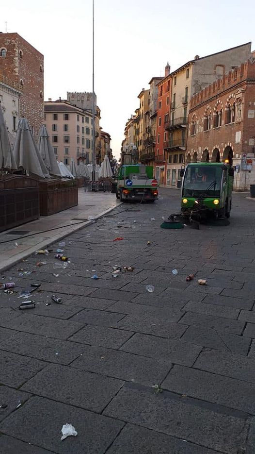 Dopo la festa, durata quasi tutta la notte, le strade del centro cittadino non erano però per così dire molto presentabili, come lo stesso sindaco Federico Sboarina ha sottolineato sui suoi profili social. Per questo gli operatori di Amia si sono messi al lavoro fin dall’alba per rimettere le cose a posto. E stamattina Verona è tornata in perfetta forma, quasi come niente fosse successo. Ma il ricordo della festa e della vittoria, quello sarà impossibile cancellarlo.