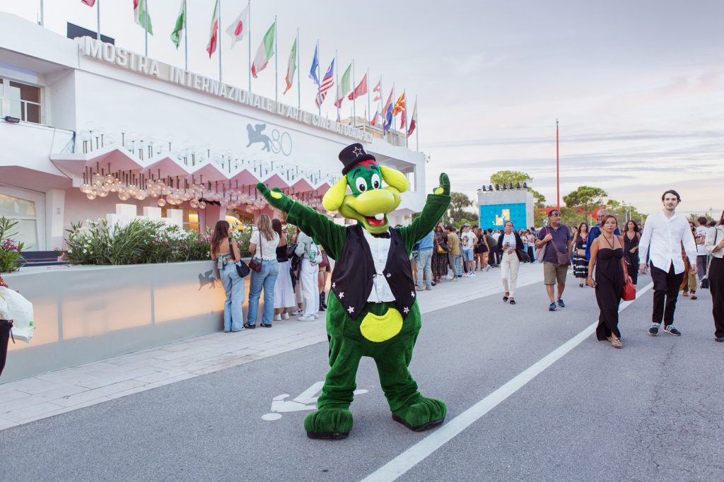 Il simpatico draghetto verde – vestito di tutto punto con un impeccabile abito per le grandi occasioni – è stato visto approdare direttamente da un‘esclusiva lancia al prestigioso Hotel Excelsior di Venezia, sfilando lungo il red carpet riservato alle più grandi celebrities internazionali, accompagnato da uno degli attori italiani con più caratura al mondo: Giancarlo Giannini. L’inedita coppia si è concessa ai fotografi con simpatia, coinvolgendo la folla con momenti di brioso intrattenimento.