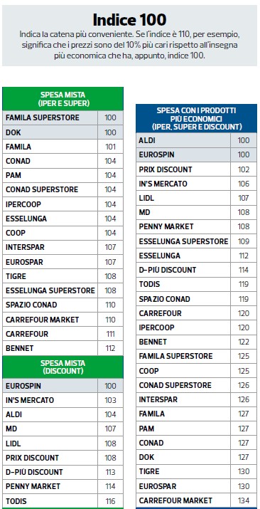 Altroconsumo fa notare che da un confronto tra l’indagine di quest’anno e quella dell’anno scorso (prezzi di maggio 2021) si scopre che ad aver aumentato di più i prezzi – del 5,2% in media – sono stati i discount. Che però in termini assoluti restano più economici. La classifica della spesa più economica in assoluto – cioè fatta comprando solo i prodotti meno cari sullo scaffale – è dominata come sempre dai discount (prime sette posizioni). Anche nel 2022 in vetta c’è Aldi, ma quest’anno a pari merito con Eurospin. Rispetto all’ultima in classifica, Carrefour Market, hanno prezzi più bassi di ben il 34%