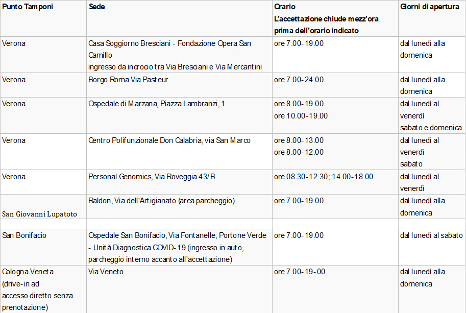 L’Ulss 9 Scaligera, per mettere ordine nel caos tamponi che ormai da giorni sta creando disagi in moltissime famiglie di Verona e provincia, ha reso noto orari e sedi dei centri tampone. Ecco le tabelle.