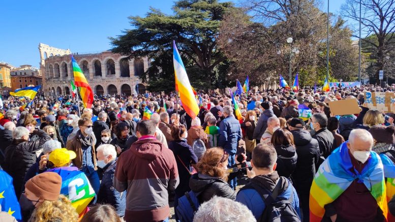 La manifestazione per la pace in piazza Bra contro la guerra in Ucraina.