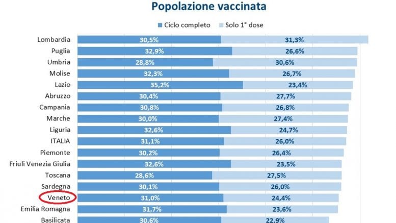 Un veneto su tre ha concluso il ciclo vaccinale. A sostenerlo il settimanale rapporto Gimbe, secondo il quale il 31% dei veneti ha già avuto due dosi di vaccino, in linea con la media nazionale che è del 31,1%. In ulteriore miglioramento, nella settimana tra il 23 e il 29 giugno, anche tutti gli altri indicatori regionali, con i posti letto negli ospedali occupati all’1% sia per quel che riguarda i reparti che per le terapie intensive, mentre diminuisce di un altro 36,3% la variazione percentuale di nuovi casi.