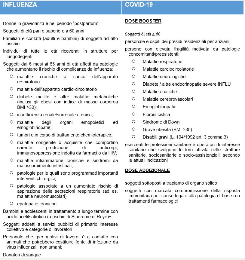Categorie per le quali sono raccomandati il vaccino antinfluenzale e la terza dose anti Covid.