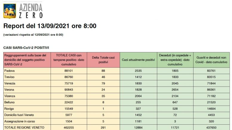 Sono 291 i nuovi positivi da Coronavirus registrati da ieri mattina, domenica 12 settembre, in Veneto, che portano il totale dei casi attualmente positivi a 12.884, in aumento rispetto ai giorni precedenti. Nello stesso periodo invece sono 24 i nuovi positivi registrati nella sola provincia di Verona: il numero degli attualmente positivi a Verona e provincia è ora di 1.828, sostanzialemnte stabili.