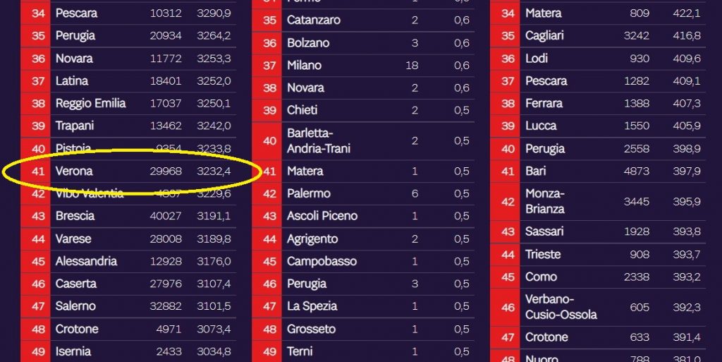 Negli omicidi da incidente stradale Verona è al 32esimo posto, 45esimo per i furti d’auto, mentre sale pericolosamente al 26esimo posto per le denunce dal reato di usura. E’ invece 104esima, al terzultimo posto, per quel che riguarda le denunce di associazione di tipo mafioso.