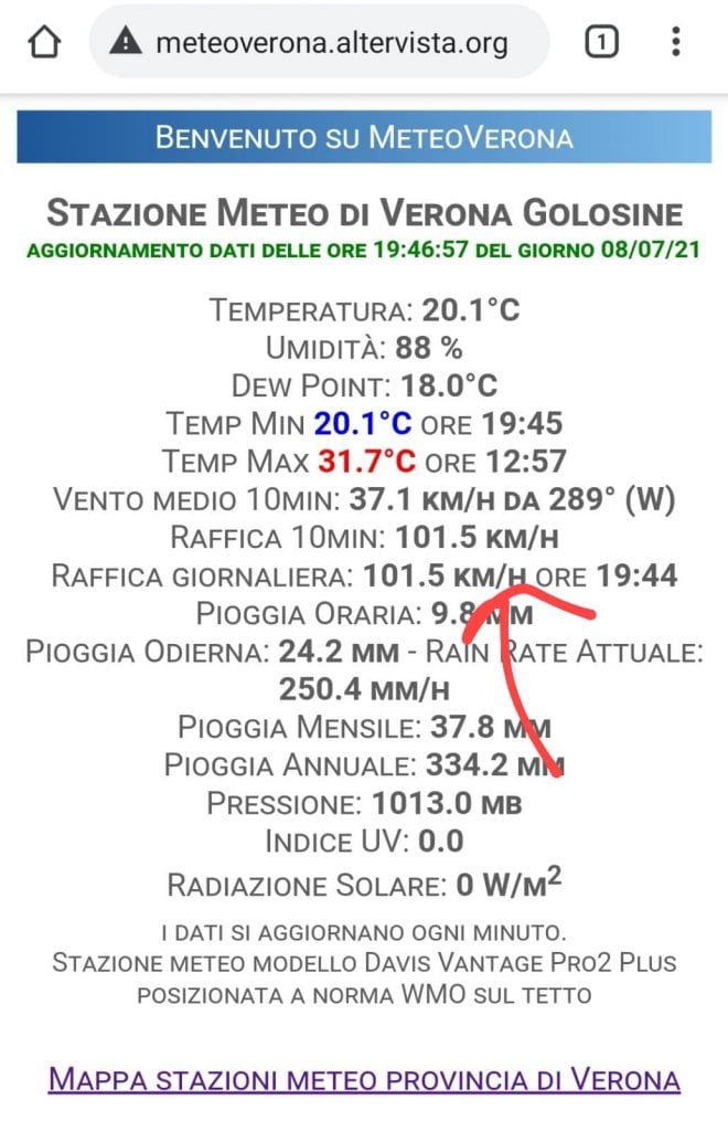 Un fenomeno, quello di ieri, più intenso di quello dello scorso agosto, che spazzò via alberi come stuzzicadenti: “Mai vista una cosa del genere”, conclude Meteo4 Verona. Mostrando i 101,5 km/h registrati alle 19.46 di ieri dalla stazione meteo delle Golosine.