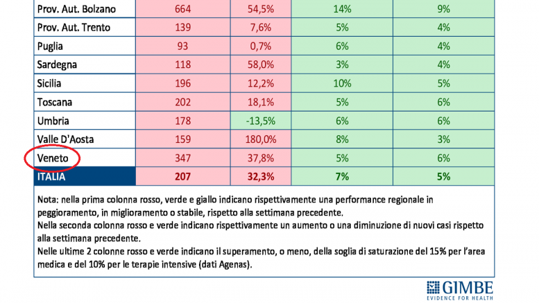 In tutte le Regioni tranne Calabria e Umbria si rileva un incremento percentuale dei nuovi casi, con variazioni che vanno dal 0,7% della Regione Puglia al 180% della Valle D’Aosta. In 84 Province si registra un’incidenza pari o superiore a 50 casi per 100mila abitanti: in Campania, Friuli-Venezia Giulia, Lazio, Liguria, Marche, Umbria e Veneto tutte le Province raggiungono o superano tale soglia. In 7 Province si contano oltre 150 casi per 100mila abitanti: Trieste (638), Bolzano (402), Gorizia (369), La Spezia (248), Forlì-Cesena (219), Padova (179) e Vicenza (152). “Di fronte a questi numeri – commenta Cartabellotta – è inaccettabile che gli amministratori non abbiano introdotto restrizioni locali, seppur impopolari, accettando il rischio che la diffusione del contagio trascini l’intera Regione in zona gialla”.