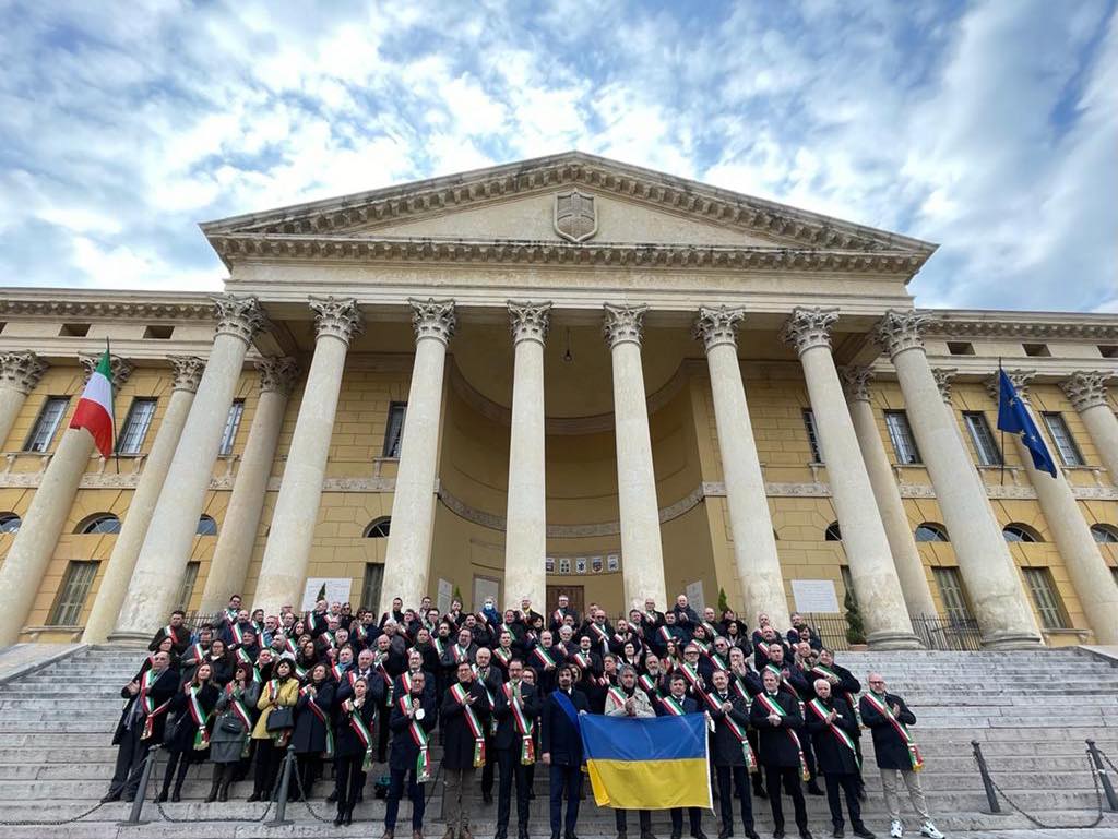 Davanti all’Arena, per l’occasione ricolma di bandiere gialloblù dell’Ucraina, si sono esibite le ginnaste di ‘Ritmic Art Verona’, guidate da una insegnante italiana, Martina De Marzi, e una ucraina, Olena Samoylenko. In piazza, presenti anche tutti i sindaci dei Comuni della provincia di Verona, guidati dal primo cittadino veronese Federico Sboarina. Per loro anche una foto di gruppo all’interno dell’Arena.