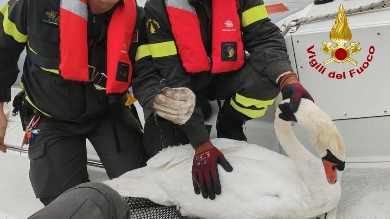 I vigili del fuoco sono intervenuti dal vicino distaccamento con un’autobotte e un gommone per raggiungere il cigno che ormai senza forze si è lasciato facilmente catturare dai vigili, che con delicatezza hanno estratto l’amo e il filo che lo intrappolavano e liberato il volatile. Il soccorso si è concluso in circa un’ora con il rientro in sede di personale e mezzi.