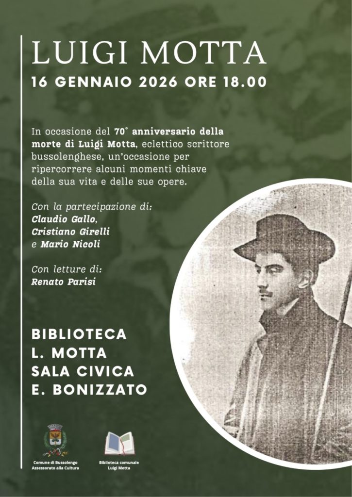 A 70 anni dalla sua scomparsa, Bussolengo rende omaggio a uno dei suoi figli più illustri e prolifici: lo scrittore Luigi Motta. Venerdì 16 gennaio, alle ore 18, la sala civica “E. Bonizzato” nella biblioteca comunale diventerà il palcoscenico di un incontro volto a riscoprire l’eredità di un autore che ha segnato la letteratura popolare italiana.