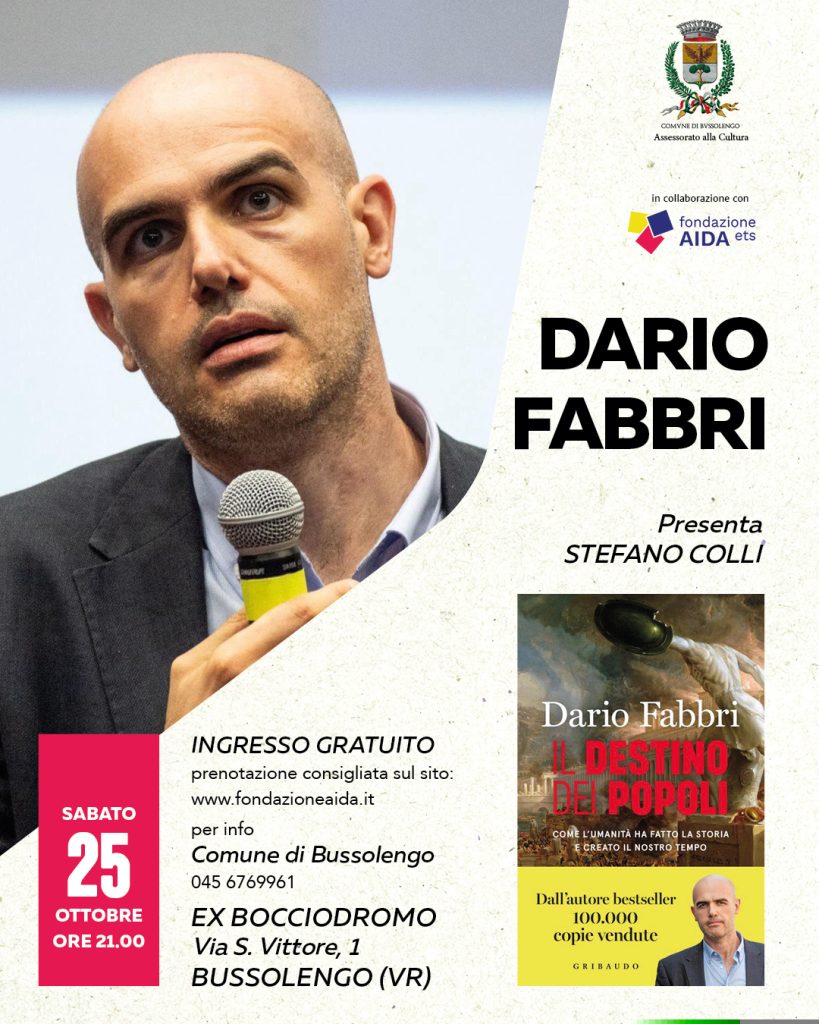 Il noto analista geopolitico e direttore della rivista Domino, Dario Fabbri, sarà ospite a Bussolengo sabato 25 ottobre alle ore 21, per una serata di riflessione sui grandi temi della politica internazionale.