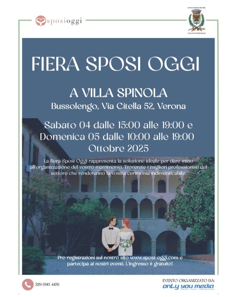 Torna a Bussolengo l’evento dedicato al giorno più bello: “Sposi Oggi” celebra la sua seconda edizione e si prepara ad accogliere le coppie che pianificano il matrimonio. La fiera sarà sabato 4 e domenica 5 ottobre a Villa Spinola.