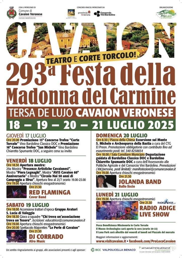 Cavaion Veronese è pronta per la Festa della Madonna del Carmine, meglio conosciuta come “Tersa de Lujo”, giunta quest’anno alla sua 293esima edizione. Dal 17 al 21 luglio, la Corte Torcolo e l’Arena Torcolo diventeranno il cuore di cinque giorni di tradizione, convivialità e musica sotto le stelle.