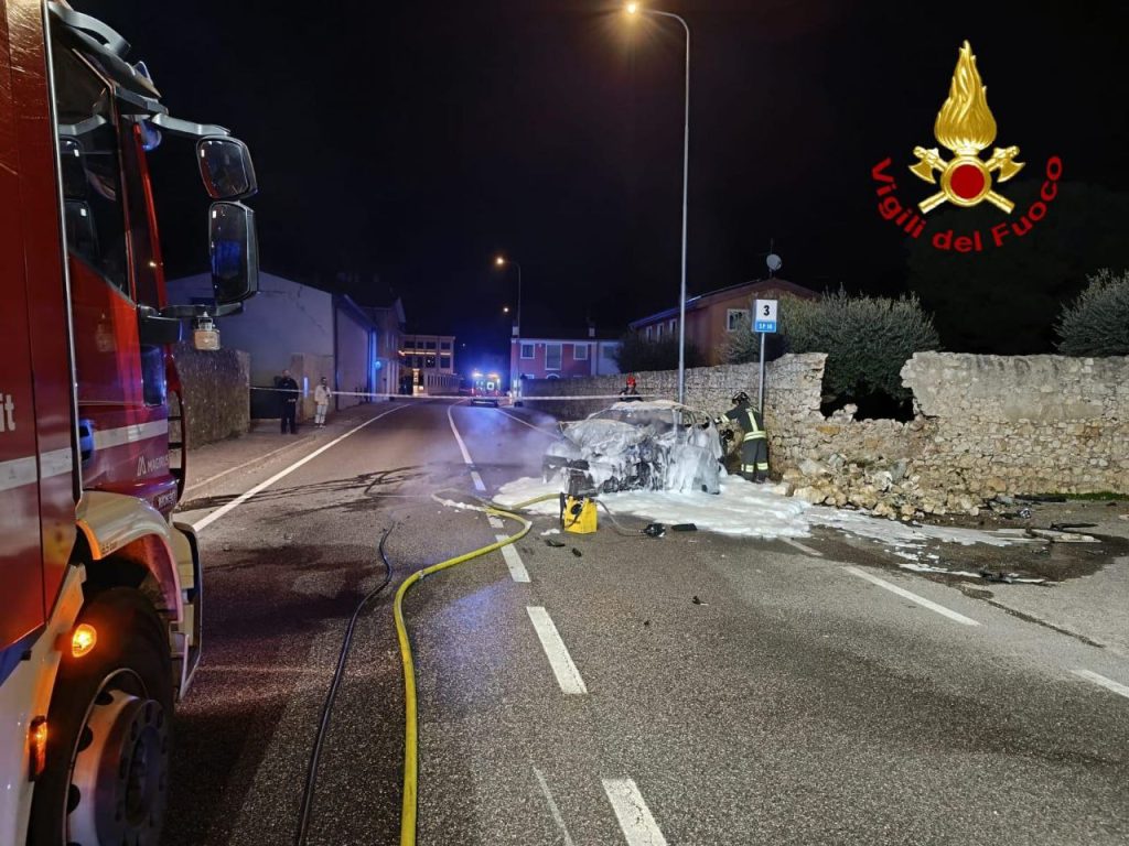 Auto si schianta contro un muro e va a fuoco: paura a Colognola ai Colli. Le foto.