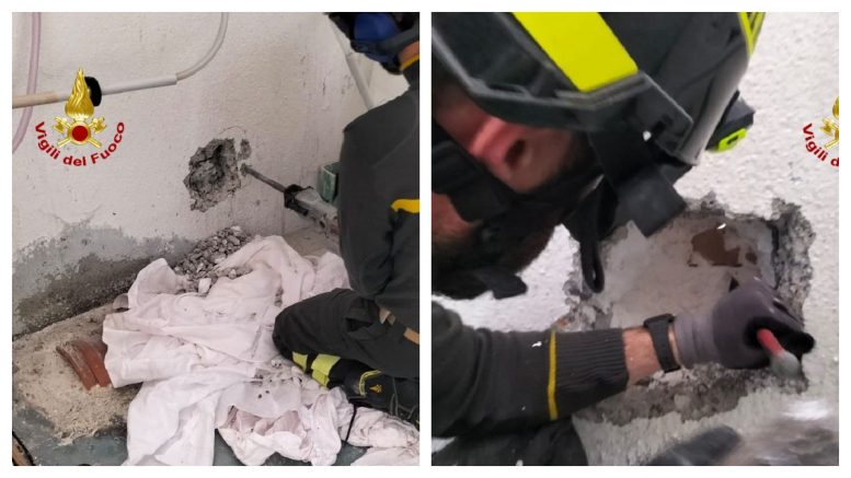 I vigili del fuoco salvano un gattino rimasto incastrato nel muro.