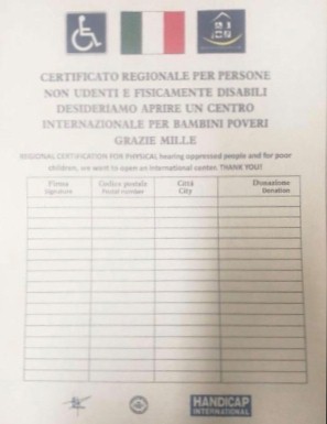 Il modulo che utilizzano, in lingua italiana e inglese, prevede la compilazione di alcune colonne con l’indicazione dell’importo della donazione, della città, del codice di avviamento postale e della firma e riporta il marchio di una fantomatica associazione chiamata “Handicap International”. A seguito degli accertamenti della Questura, questa associazione si è rivelata inesistente.