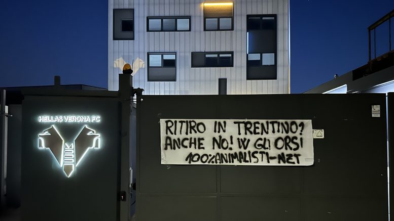 Ennesimo blitz dei militanti del movimento Centopercento animalisti a Verona: nella serata di ieri, lunedì 8 luglio, si sono recati alla sede dell’Hellas e hanno affisso uno striscione sui cancelli dell’ingresso: “Ritiro in Trentino? Anche no! W gli Orsi!